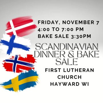 Scandinavian Dinner and Bake Sale The 30th Annual Scandinavian Dinner at First Lutheran Church will be held on Friday, November 7, 2025 from 4pm to 7pm. The church is located at 10630 Main Street, Hayward, WI. Lutefisk, lefse, Swedish meatballs and all the trimmings will be served. There will also be a bake sale featuring…