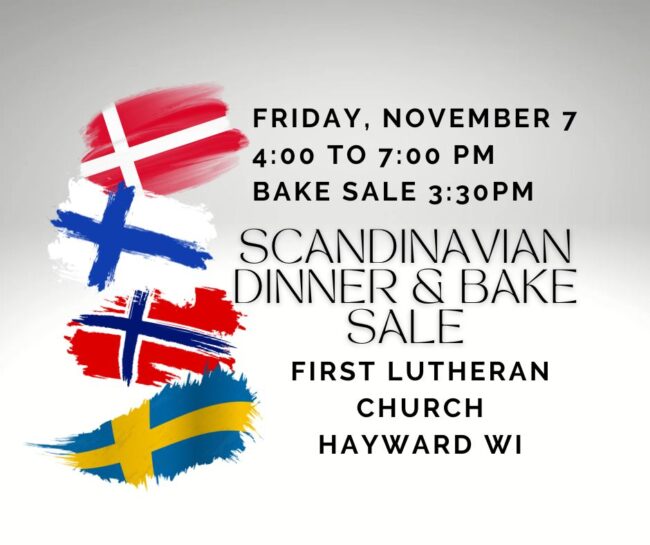 Scandinavian Dinner and Bake Sale The 30th Annual Scandinavian Dinner at First Lutheran Church will be held on Friday, November 7, 2025 from 4pm to 7pm. The church is located at 10630 Main Street, Hayward, WI. Lutefisk, lefse, Swedish meatballs and all the trimmings will be served. There will also be a bake sale featuring…