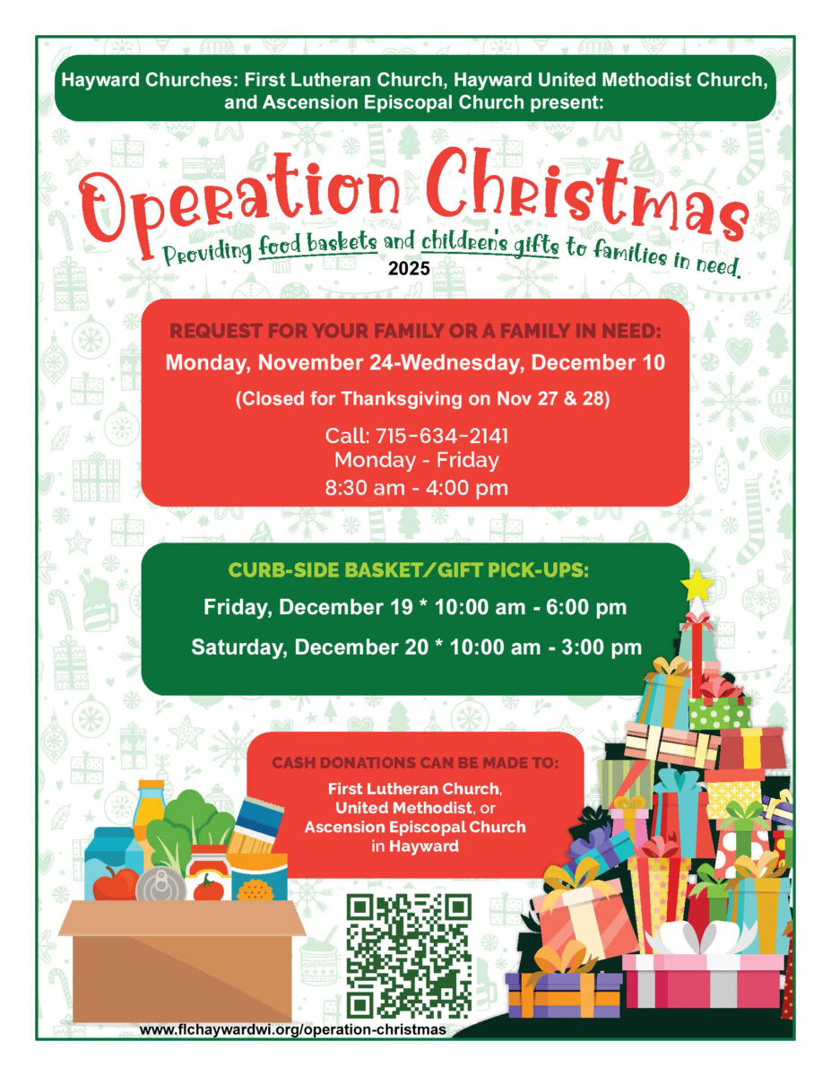 • For those who would like to contribute, donations can be made by check payable to Operation Christmas, %First Lutheran Church, P.O. Box 346, Hayward, WI 54843. We also collect new hats and mittens that are distributed to local schools in January; those can be dropped off at First Lutheran Church prior to the first week in January.